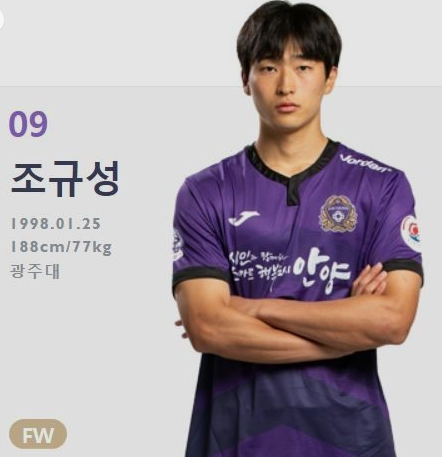 조규성은 1998년 1월생으로 188cm의 큰 신장을 가진 스트라이커 포지션에서 뛰고 있는 선수입니다. 2019년도에 FC 안양에서 데뷔를 하여 이듬해 전북 현대로 이적 후 2021년 군입대를 통해 현재는 김천 상무 소속으로 활약하고 있습니다.