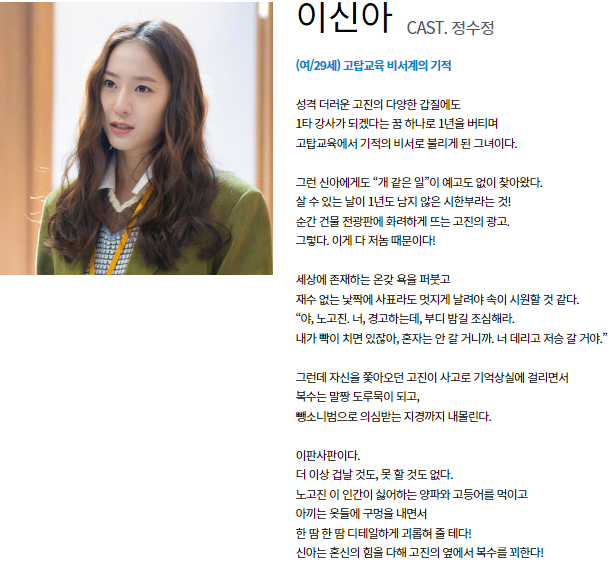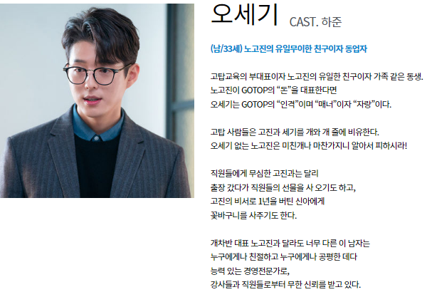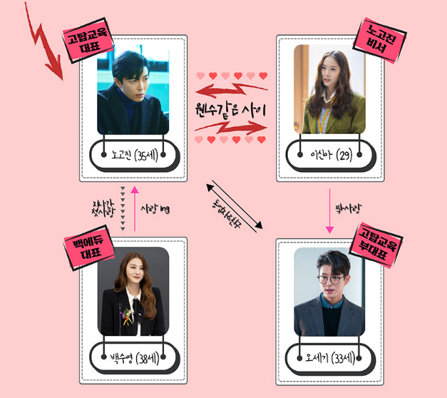 인물관계도를 살펴보면 노고진(김재욱)과 이신아(정수정)은 대표와 비서 관계로 웬수같은 사이라고 합니다. 서브 주연으로 오세기(하준)이 둘 사이에 끼어있는 인물로 나오고 있습니다.